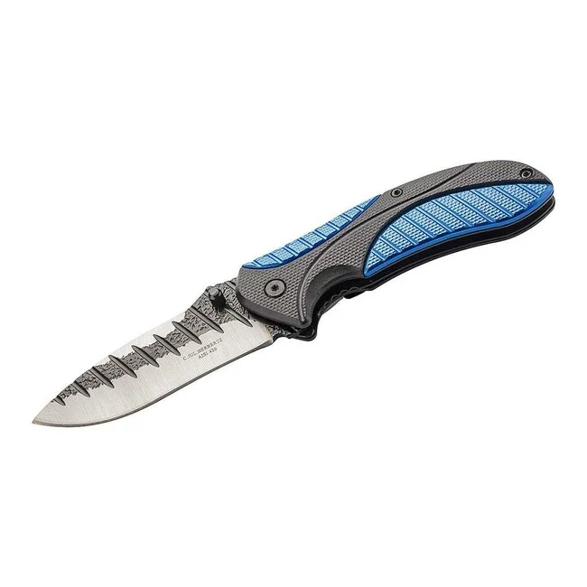 Das moderne Herbertz-Messer ist aus rostfreiem AISI 420 Stahl mit Stonewash-Finish gefertigt. Seine Klinge hat eine glatte Schneide und weist ein interessantes Design auf. Das Messer öffnet sich mit einem Daumenknopf und ist mit.