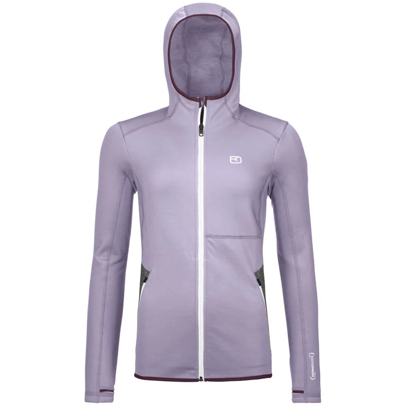 Der Fleece Hoody für Damen ist ein Allrounder mit hoher Funktionalität, viel Bewegungsfreiheit und natürlichen Klimakomfort für kalte Wintertage am Berg. Der bewährte Hoodie hat durch ein besonderes Strickverfahren eine matte Oberfläche, die seinen schlichten und sportlichen Look unterstreicht. Dabei sind die hochwertigen Materialien rundum nachhaltig: Die einzigartige Mischung aus weicher Merinowolle auf der Innenseite und recyceltem Polyester außen machen den Hoodie besonders widerstandsfähig und atmungsaktiv. Da Merino Fleece sehr elastisch ist, passt sich das Fleece Hoody für Damen optimal an den Körper an und gibt dabei maximale Bewegungsfreiheit. Für angenehmen Klimakomfort sorgt die weiche Merinowolle, die von Natur aus feuchtigkeits- und temperaturregulierend ist und sich angenehm auf der Haut anfühlt. Zwei seitliche Eingriffstaschen mit traditionellem Loden der Firma Steiner halten die Hände warm und bieten Platz für wichtige Kleinigkeiten, die griffbereit sein sollen. Dank einer speziellen VerarbeitungsTechnik schließen die Daumenschlaufen optimal ab, sodass selbst hier keine Wärme verloren geht. Damit ist unser Fleece Hoody für Damen bereit für all deine Winteraktivitäten am Berg und im Tal.